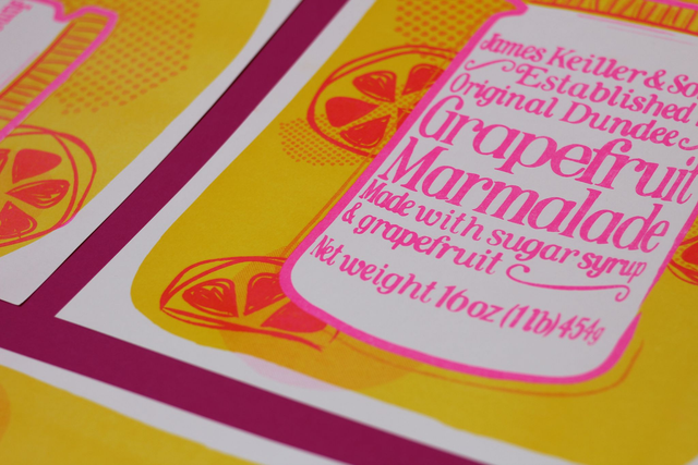 A bold and beautiful Riso print celebrating the iconic Keiller's Marmalade which was made in Dundee. An ode to one of the famous three J's (Jute, Jam and Journalism) – this print puts a quirky twist on a Dundonian treasure. This would look lovely in any home, and is guaranteed to brighten up any room with its pop of colour! A two colour, limited edition Risograph – printed in beautiful fluorescent pink and yellow inks.